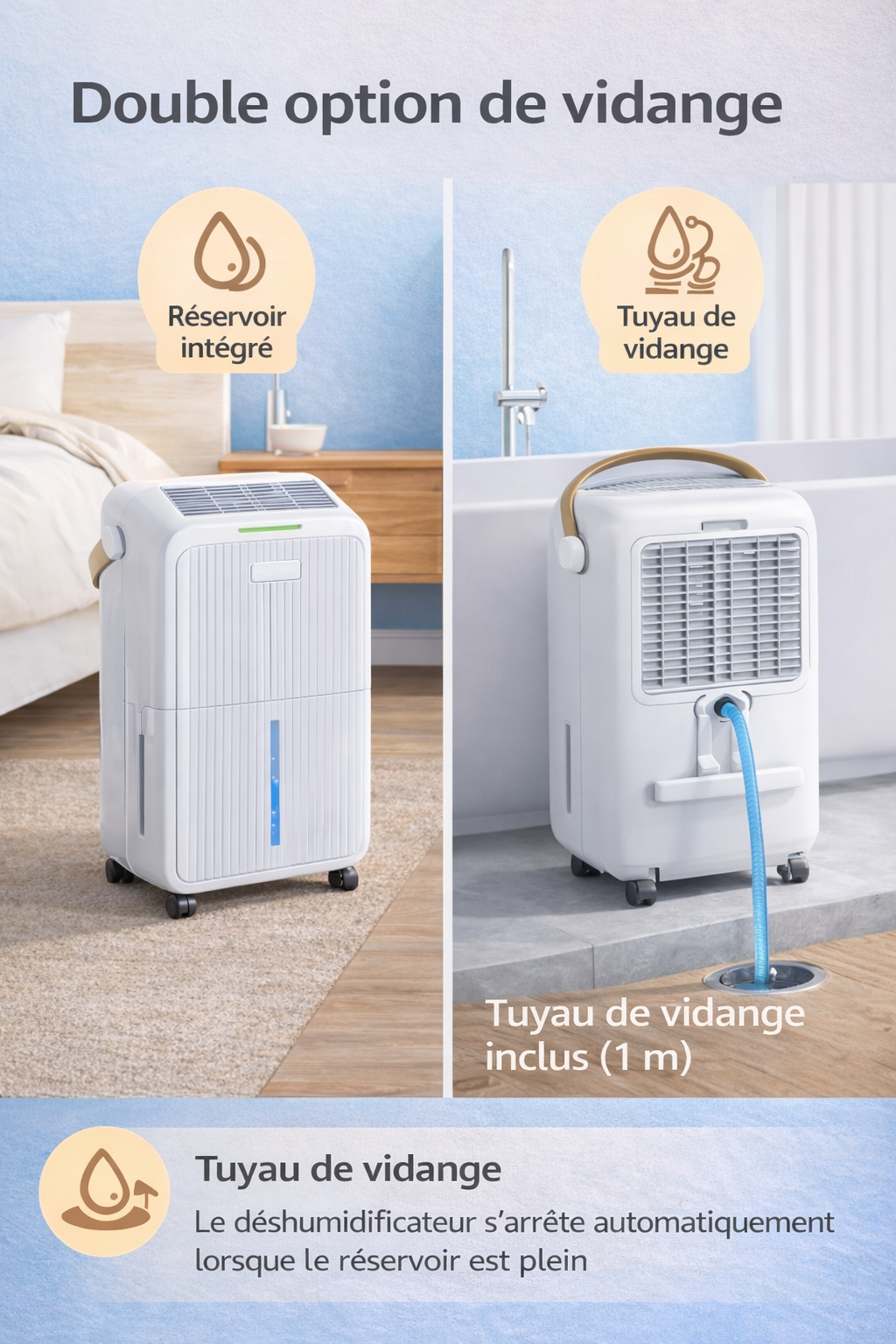 Il est équipé d’un réservoir d’eau de 3,3 litres avec protection contre les débordements. Une vidange continue est possible grâce au tuyau fourni. Un affichage LED intégré permet d’indiquer le niveau d’humidité ambiante par code couleur.